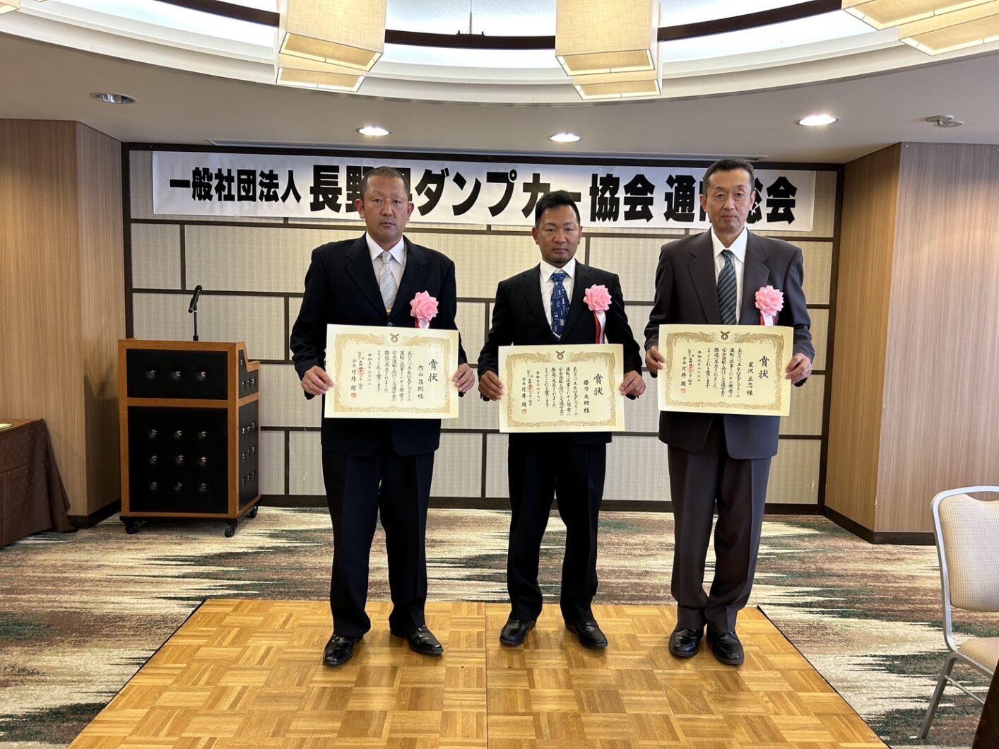 この度、一般社団法人長野県ダンプカー協会様より「優良ダンプカー運転者」として運転手3名の表彰をいただきました。