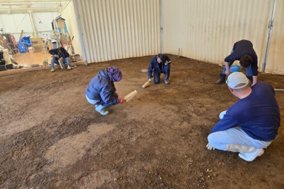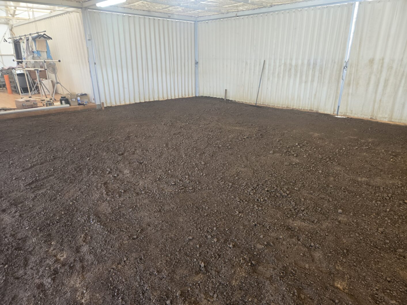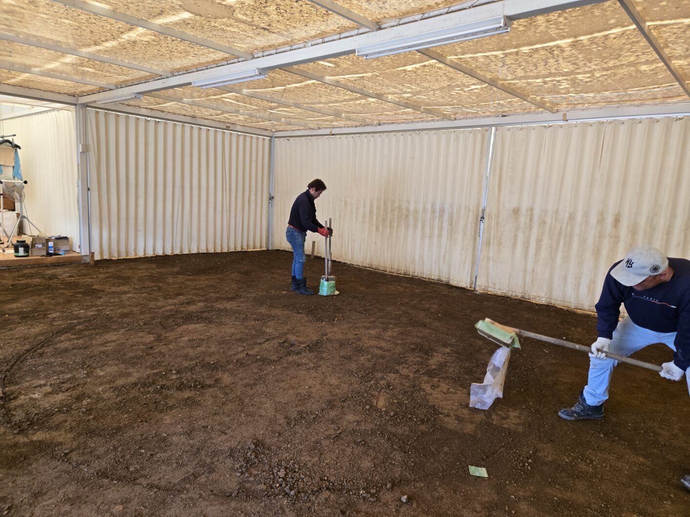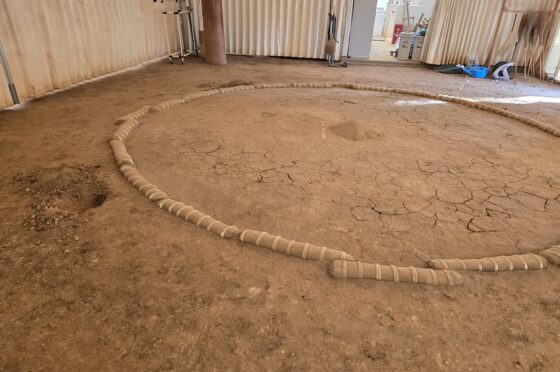 今までの土俵を一度崩して更地に戻した後、土に水分を加えながら専用の道具を用いて念入りに叩き、固めました。 練習用土俵ということで、【皿土俵】を作成いたしました。